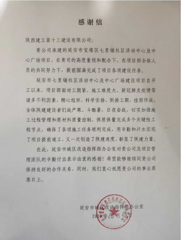 在繼南川河防洪工程、延安大學(xué)新校區(qū)體育中心項目之后,10月15日,公司負(fù)責(zé)施工的延安市七里鋪社區(qū)活動中心及中心廣場項目收到了來自建設(shè)單位的感謝信。延安市城區(qū)改造指揮部在感謝信中提到:陜建十三建公司延安寶塔區(qū)七里鋪社區(qū)活動中心及中心廣場項目全體建設(shè)者戰(zhàn)嚴(yán)寒、斗酷暑,日夜奮戰(zhàn),切實加強施工過程管理和質(zhì)量控制,保質(zhì)保量完成了多個關(guān)鍵性工程節(jié)點,確保了各項施工任務(wù)順利完成,用辛勤和汗水實現(xiàn)了項目提前竣工,又一次創(chuàng)造了陜建速度,彰顯了陜建力量。