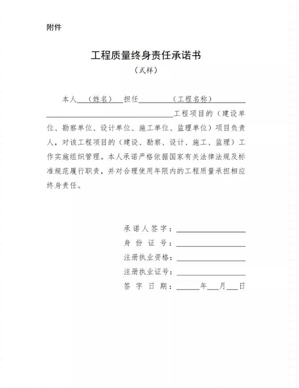 第十二條 項(xiàng)目負(fù)責(zé)人應(yīng)當(dāng)在辦理工程質(zhì)量監(jiān)督手續(xù)前簽署工程質(zhì)量終身責(zé)任承諾書(式樣參見附件),連同項(xiàng)目負(fù)責(zé)人證明材料,由建設(shè)單位(項(xiàng)目法人)報(bào)工程質(zhì)量監(jiān)督機(jī)構(gòu)備案。項(xiàng)目負(fù)責(zé)人如有更換的,應(yīng)按前述規(guī)定重新備案。