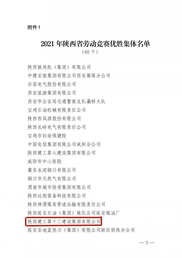近日,陜西省勞動競賽委員會公布了2021年陜西省勞動競賽優(yōu)勝集體和優(yōu)秀個人名單。陜建十三建集團被評為陜西省勞動競賽優(yōu)勝集體。