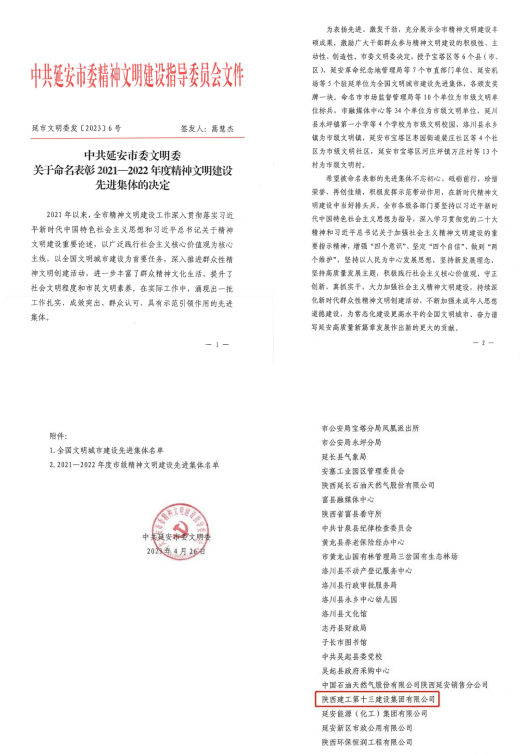 近日,延安市委表彰2021-2022年度精神文明建設(shè)先進(jìn)集體。陜西建工第十三建設(shè)集團(tuán)有限公司被評(píng)為“市級(jí)文明單位”。