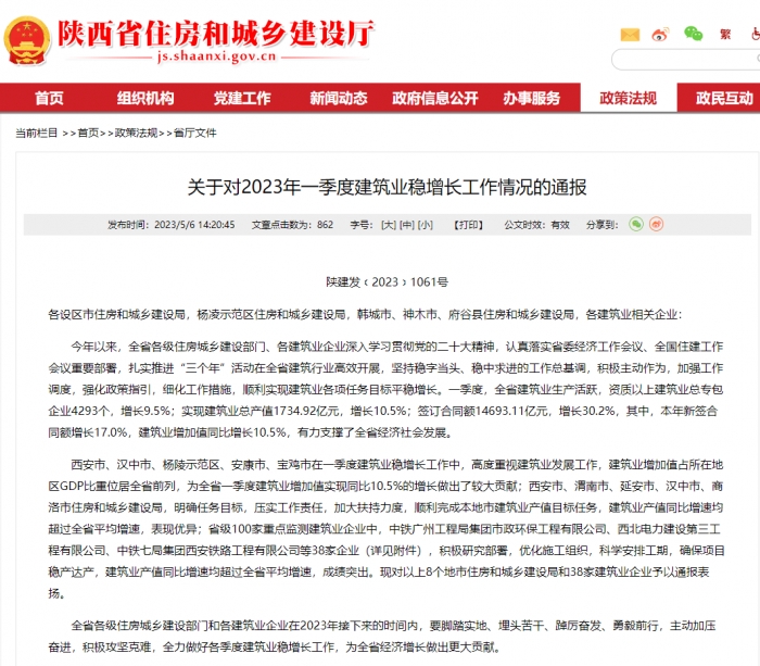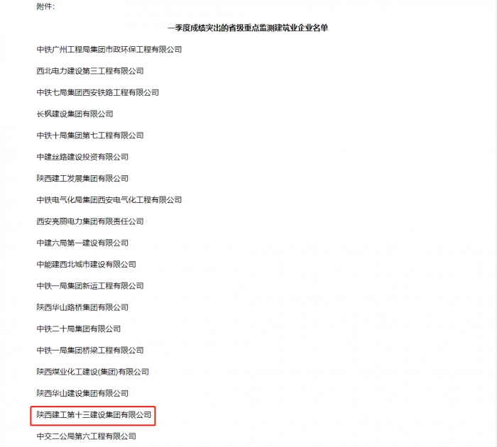 近日,陜西省住建廳通報(bào)了2023年一季度建筑業(yè)穩(wěn)增長(zhǎng)工作情況。陜西建工第十三建設(shè)集團(tuán)有限公司38家建筑業(yè)企業(yè)受表?yè)P(yáng),被評(píng)為一季度成績(jī)突出的省級(jí)重點(diǎn)監(jiān)測(cè)建筑業(yè)企業(yè)