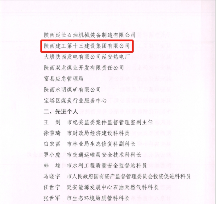 近日,延安市安全生產(chǎn)委員會(huì)表彰了2022年全市安全生產(chǎn)工作先進(jìn)集體和先進(jìn)個(gè)人,陜建十三建集團(tuán)獲評(píng)延安市安全生產(chǎn)先進(jìn)集體,這是集團(tuán)連續(xù)四年榮獲全市安全生產(chǎn)先進(jìn)集體表彰。